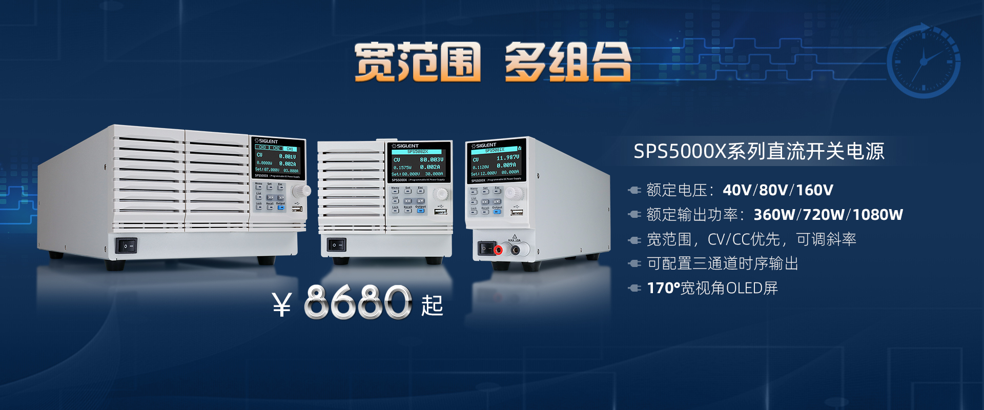 SPS5000X系列包含多種輸出電壓(40V,80V,160V)和電流組合(7.5A~90A),額定輸出功率包括360W,720W,1080W。單通道型號(hào)可支持...